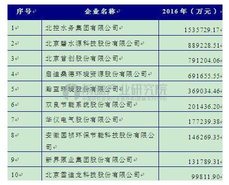 根據前瞻產業研究院發布的《2017-2022年中國污水處理行業市場前瞻與投資戰略規劃分析報告》顯示:2016年銷售收入排名前10位的企業其銷售收入都超過了9億元,其中北控水務集團有限公司更是超過了150億元。